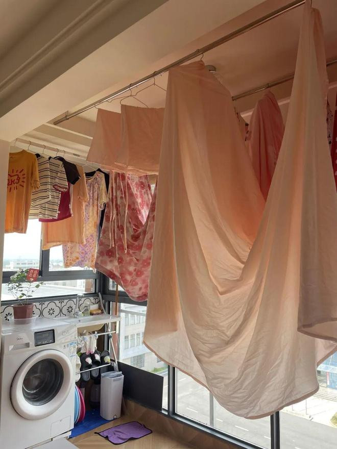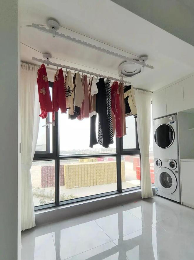 下次装修说啥也要诡计一块安逸的洗衣区,只是可惜了我这个采光极佳的全景大阳台。 提议:在曝晒区无法隐形的情况下,不错侧装一组晾衣杆,顶面的用来晒床单,侧面晒穿戴,兼具生涯和失业。