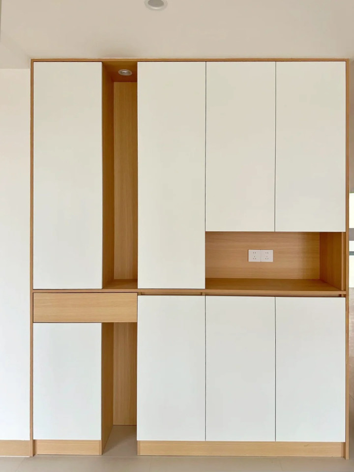 作念了洞开式与封锁式纠合,既保证了收纳空间,又不错展示一些颜面的餐具和摆件。餐边柜中间预留了插座,以后放咖啡机、烧水壶王人很便捷。这才是生涯气!
