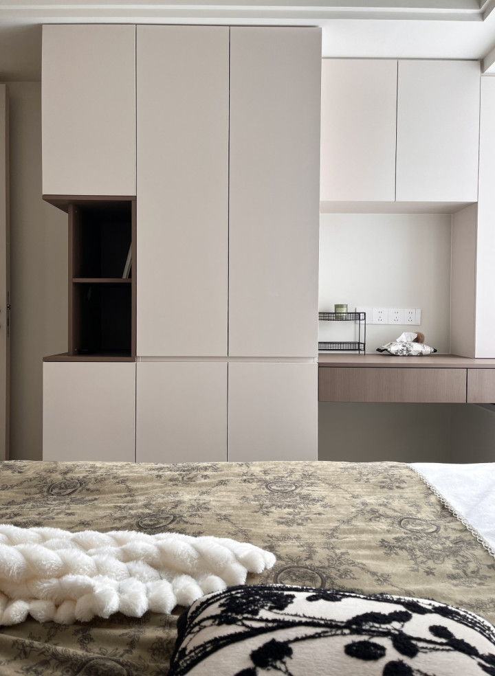 床尾是化妆柜+男士衣柜+文献收纳柜,主要扬弃咱们的万般证件;