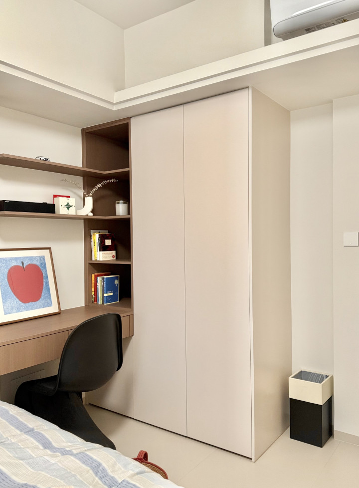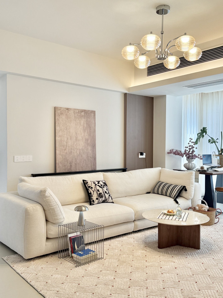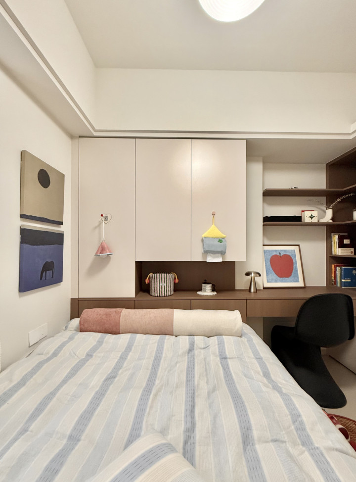 全屋作风以奶油极简风为主,举座看上去干净又剖析。全屋墙面和天花板通刷杏子灰乳胶漆,视觉上赢得了延迟感;其次大地领受奶黄色柔光砖通铺,使其显得举座感更强且仁和又显大;举座色彩长入,空间也就当然则然显得天真了不少。