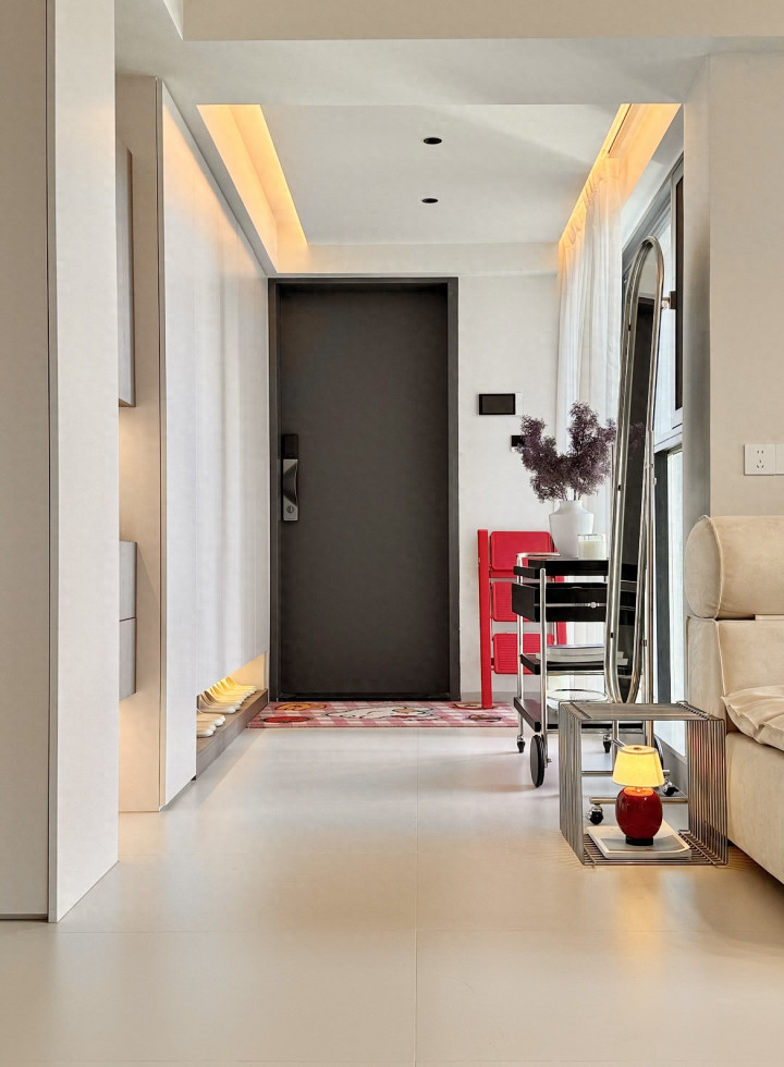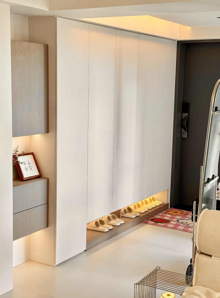 一进门的右手边作念了满墙鞋柜,用于收纳一家东谈主的鞋子和泛泛用品,柜体底部作念了架高缱绻主如若为了幸免扫地机器东谈主乱撞,其次留空了15公分用于扬弃一家东谈主的拖鞋,相差门换鞋也比拟便捷。