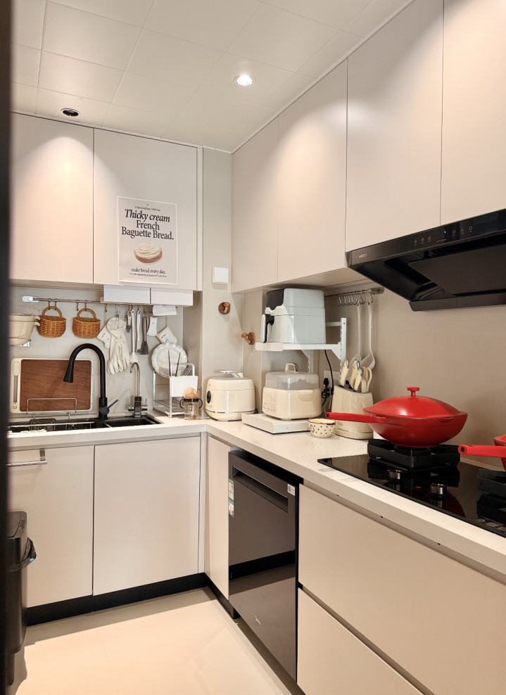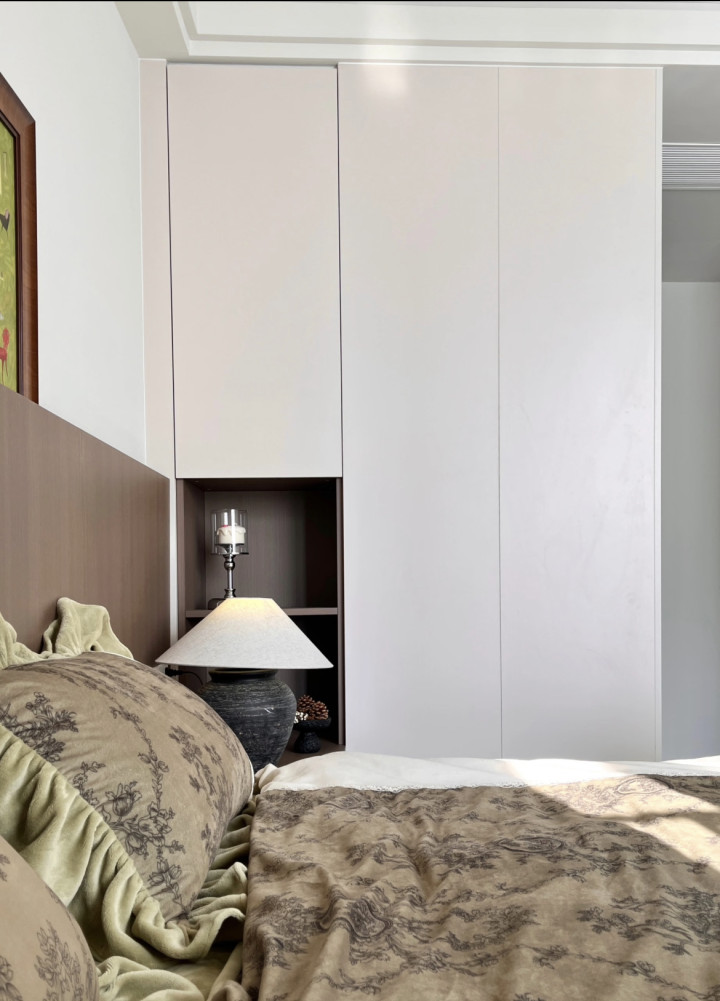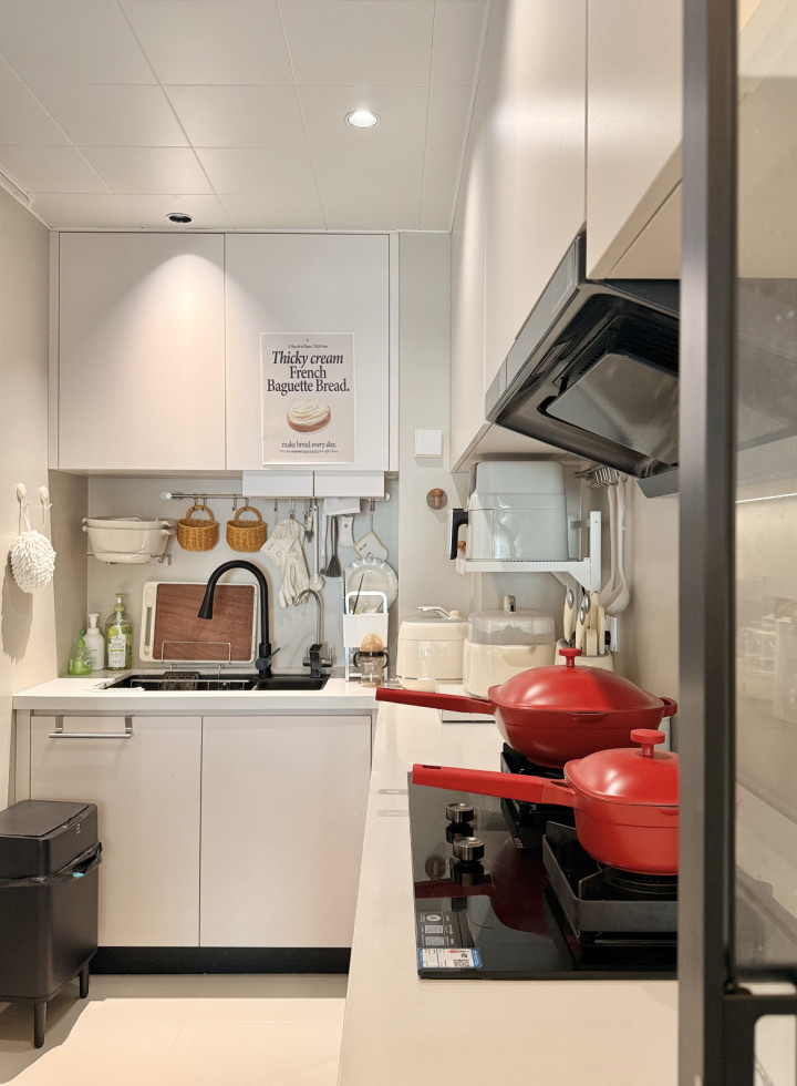 配色显通透:全浅白柜+同色台面,视觉“撑大”空间不压抑;细节藏仁和:红色锅具当点缀,连收纳筐齐选藤编款,焰火气裹着簇新感! 主卧