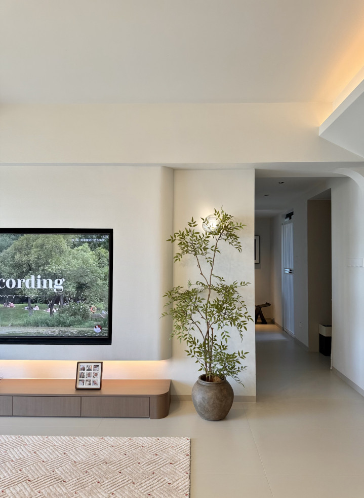 落地电视柜不留卫死活角,其次电视柜角落选定和蔼的倒圆角缱绻,与电视布景墙当然邻接,视觉上更显得联结仁和;电视墙底部作念了灯带,使其更具氛围感。