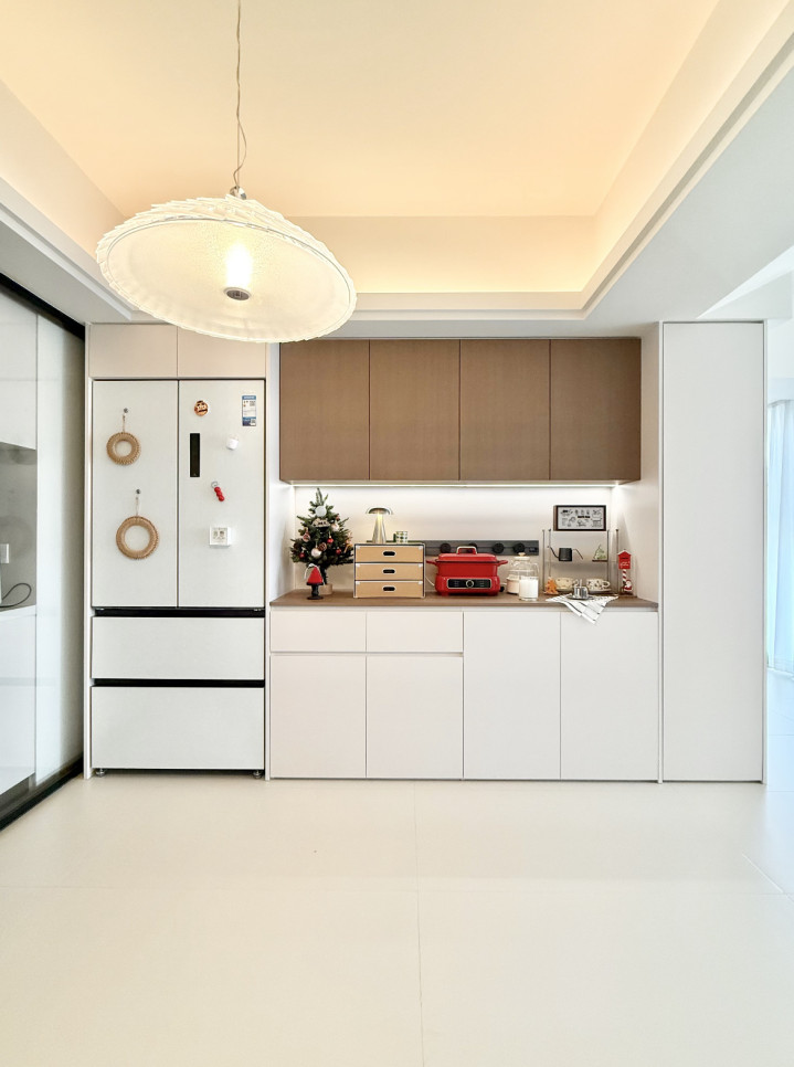 柜体配色以白色为主,行使极少棕色当作点缀,远纵眺去和墙面如胶如漆,视觉后果尽头好,一丝也不会显得突兀。