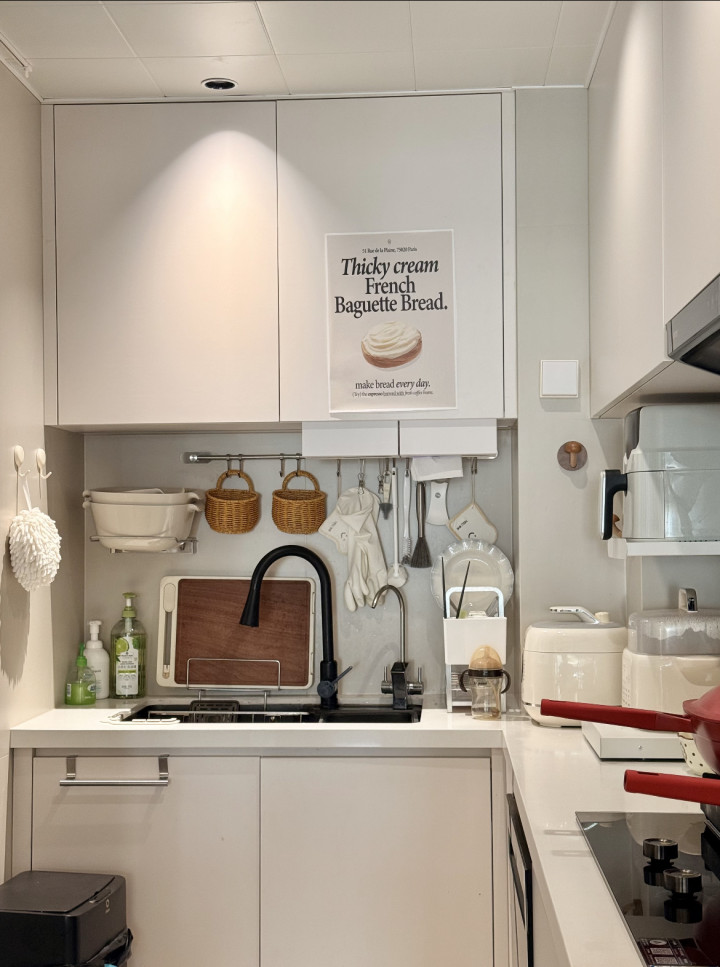 小厨房“无死角收纳术”:把每寸墙齐用成“矿藏区”!墙面狠行使:挂杆+层板把锅碗、抹布全“挂”上墙,台面空到能摆庇荫画。