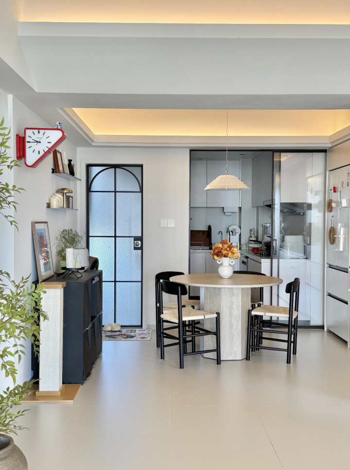 产品选得巧:圆餐桌+细框椅,视觉“缩”出3㎡空感;拱门玻璃门柔化限度,厨房藏得高档又通透;