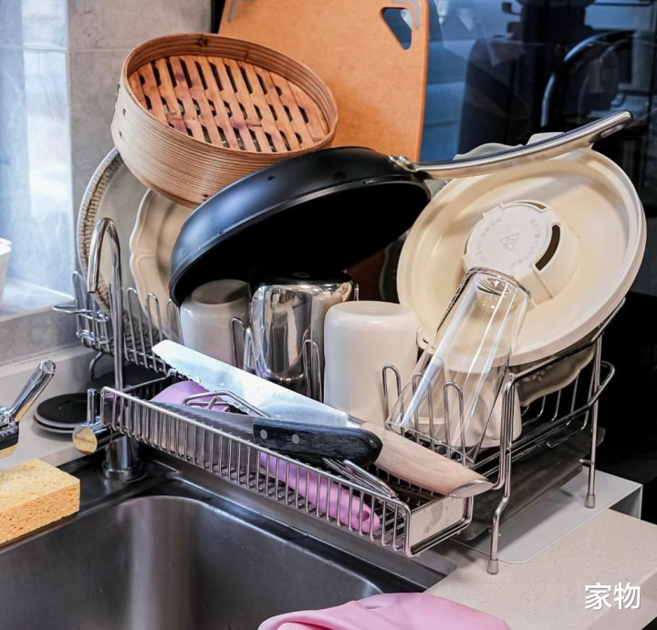 不锈钢材质的沥水架,即即是我依然买了最大号,也依旧有些放不下我家这些餐具厨具的嗅觉…… 但好在有蔓延杯架和刀架,即即是堆得很高,也照旧能稳沉恰当收纳,实用性卓绝可以,推选诸位试试。 三、双层沥水篮当豌豆苗盆