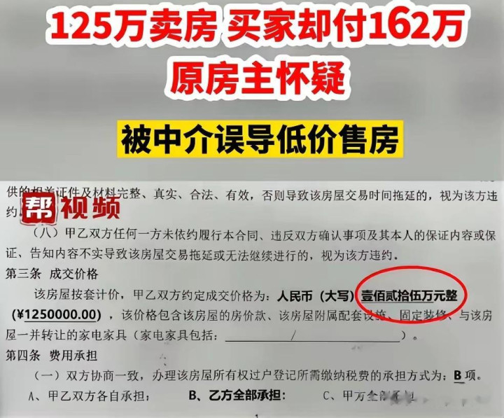 福建福州,又名须眉因资金盘活辛苦,将名下房产以125万的廉价交付中介急售。中介后果惊东说念主,短短几天就帮他找到了“全款买家”,须眉拿到125万房款后,满心运道地以为债务危急就此祛除。但是,当他前去房管局办理过户手续时,网签协议上的数字却让他已而僵在原地——成交价昭着写着162万,整整多出37万!这笔捏造隐没的巨款去了那边?濒临诽谤,中介却直截了当地甩出一句:“屋子卖多卖少是我的程序,跟你何干?”这一句话,绝对燃烧了须眉的肝火,也撕开了房产中介行业的又一暗疮。